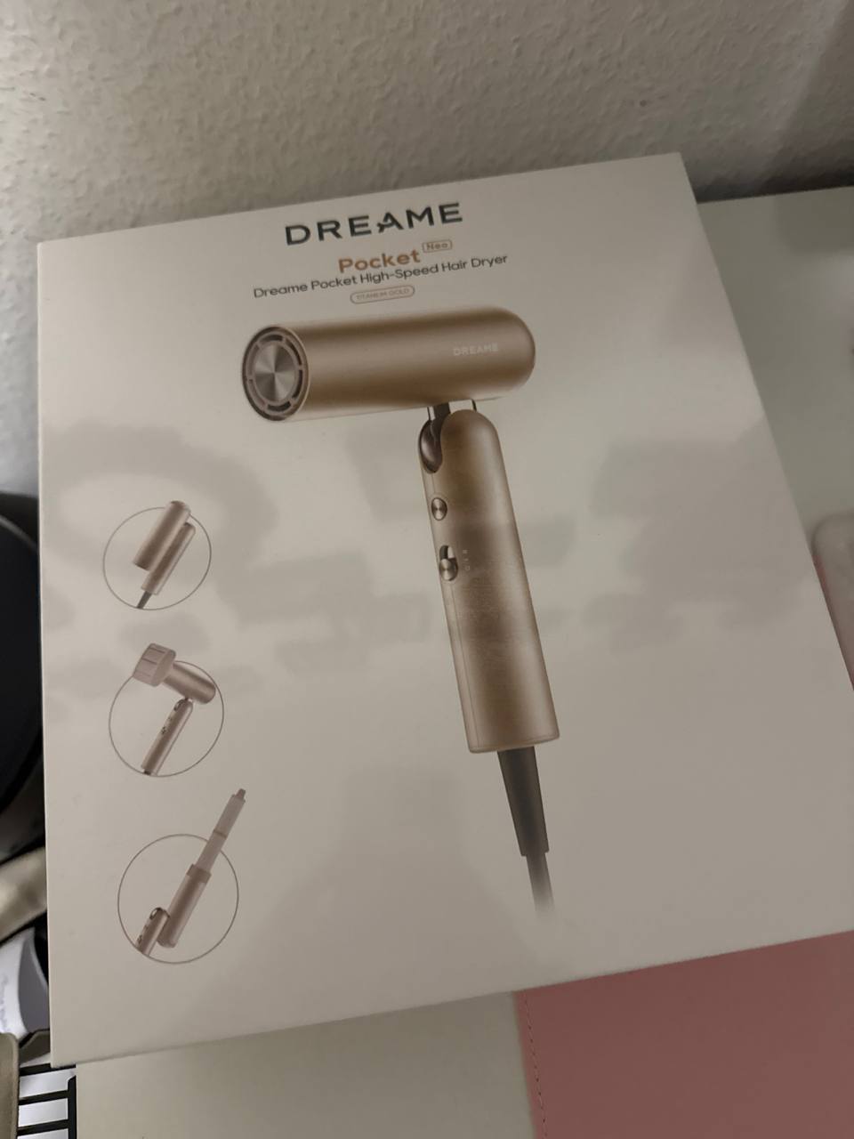 Ich benutze den Dreame Pocket High-Speed Hair Dryer nun seit einiger Zeit und bin wirklich beeindruckt! Schon beim Auspacken merkt man, wie hochwertig das Gerät verarbeitet ist – das Design in Champagne Gold sieht einfach edel und modern aus.