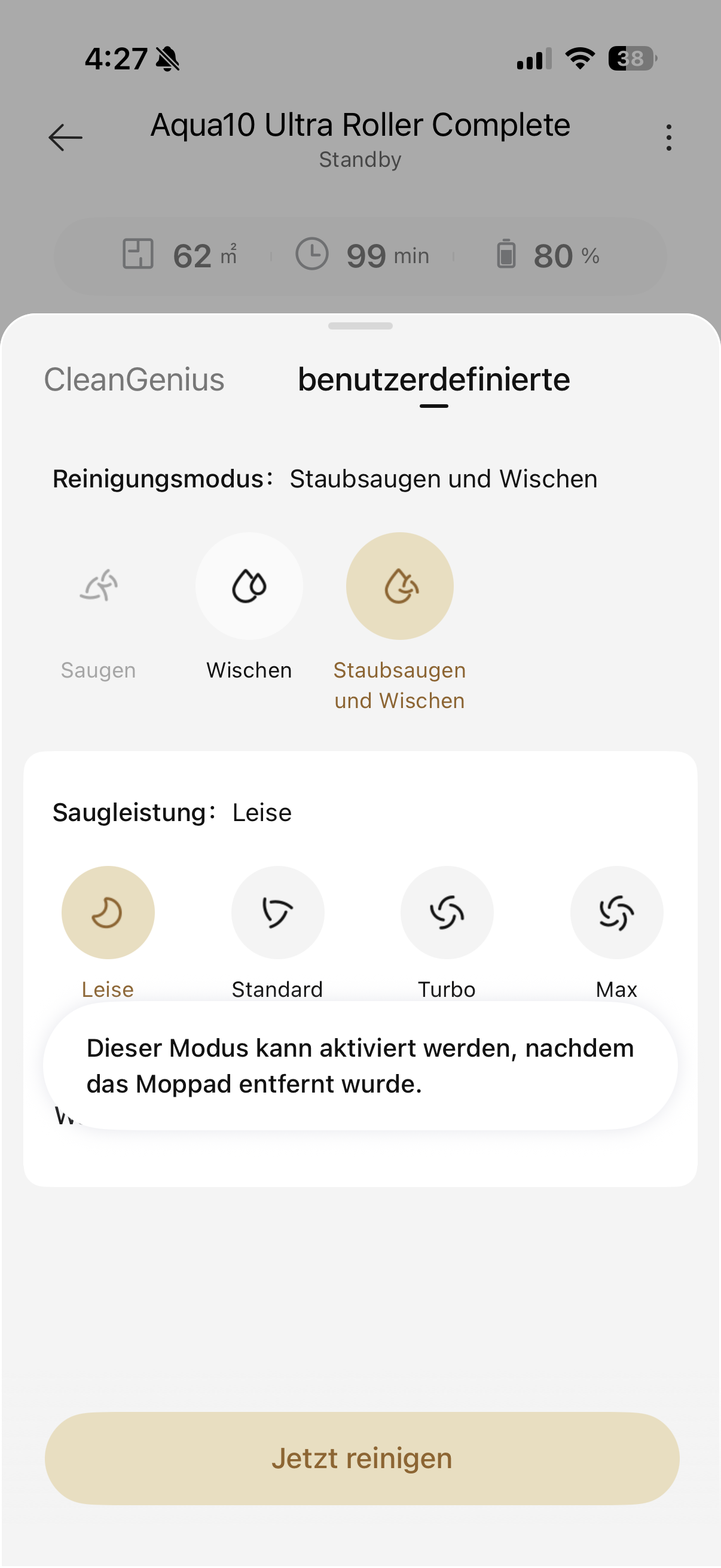 Beim Klick auf Reinigungsmodus Saugen kommt die Meldung.