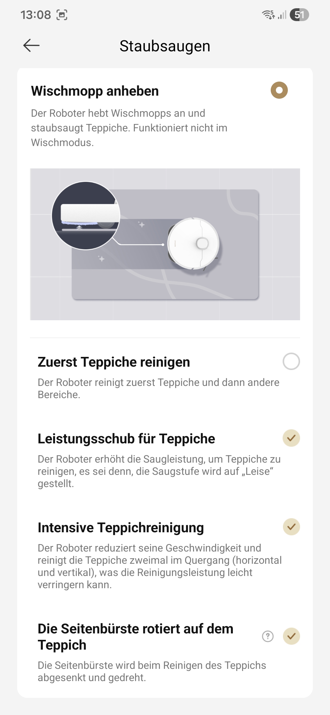 Wenn die Option "Zuerst Teppiche reinigen" abgewählt ist,  wird die Option "Intensive Teppichreinigung" (zweimal im Quergang saugen) meistens nicht ausgeführt. Wenn die Option "Zuerst Teppiche reinigen" angewählt ist, funktioniert alles.