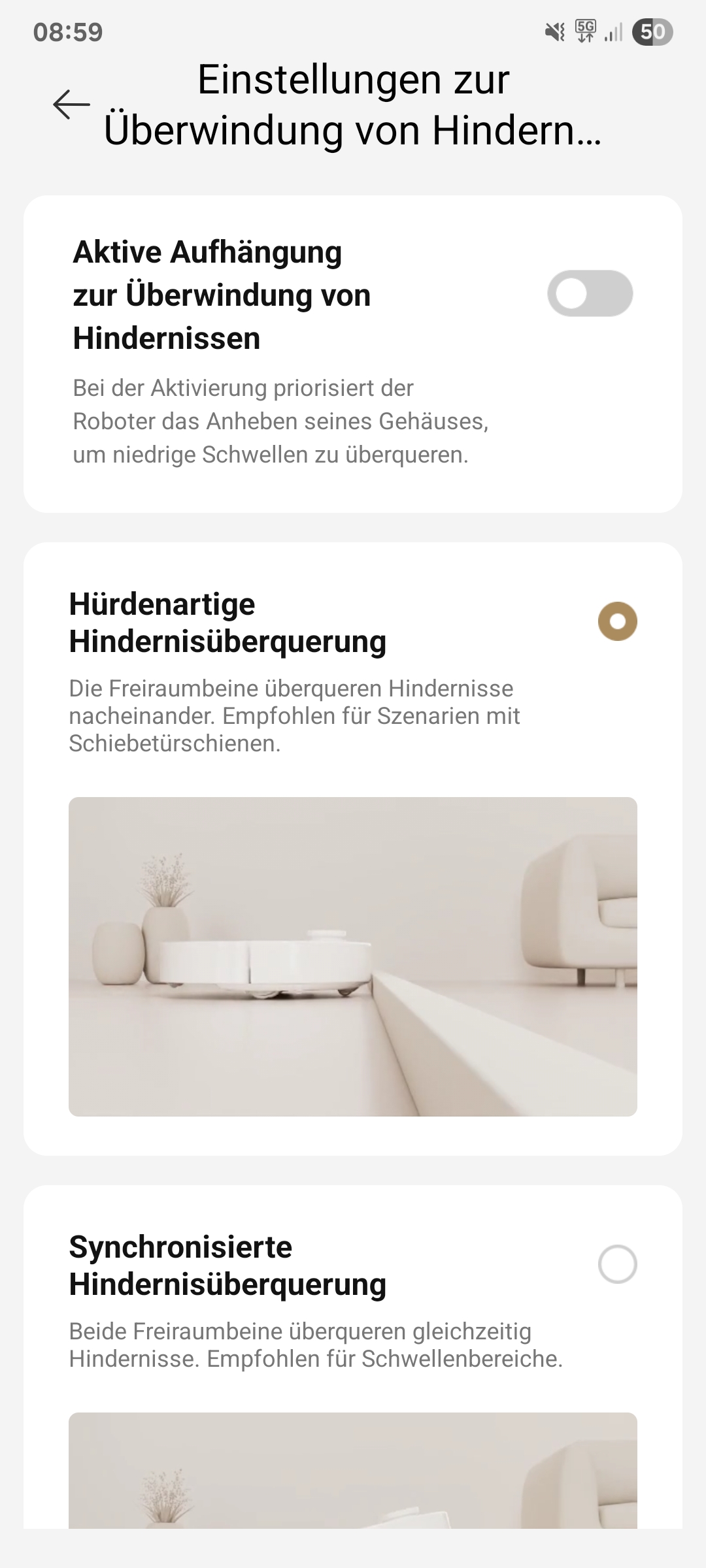 Während des Saugens hebt er sich an und versucht über die Stuhlbeine zu fahren,  obwohl die Anhebefunktion in der App deaktiviert ist. Er bleibt dann zwischen den Stuhlbeinen hängen. Den Bereich als Nogo Zone zu definieren, ist keine Option, da ich zeitweise die Stühle hochstelle und dann auch unter dem Tisch gereinigt (gewischt) werden soll. Kann man das irgendwie einstellen? In der normalen Reinigung soll er einfach nicht drüberklettern.
