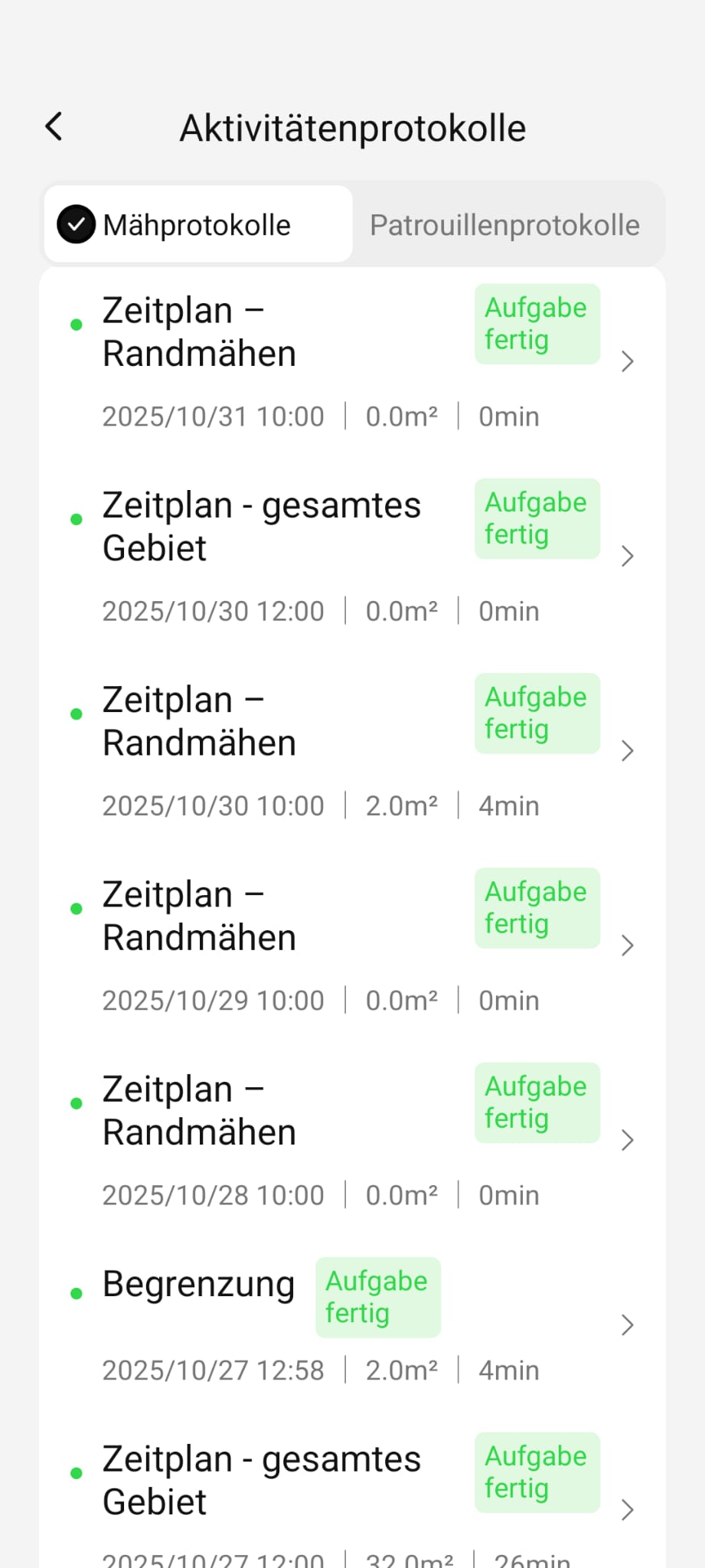 Ich habe die Möglichkeit für solche Probleme ausgeschlossen. Zum Beispiel Heute: Beim 10:00 Randmähen mäht er nicht und um 12:00 mäh er die Fläche korrekt.
