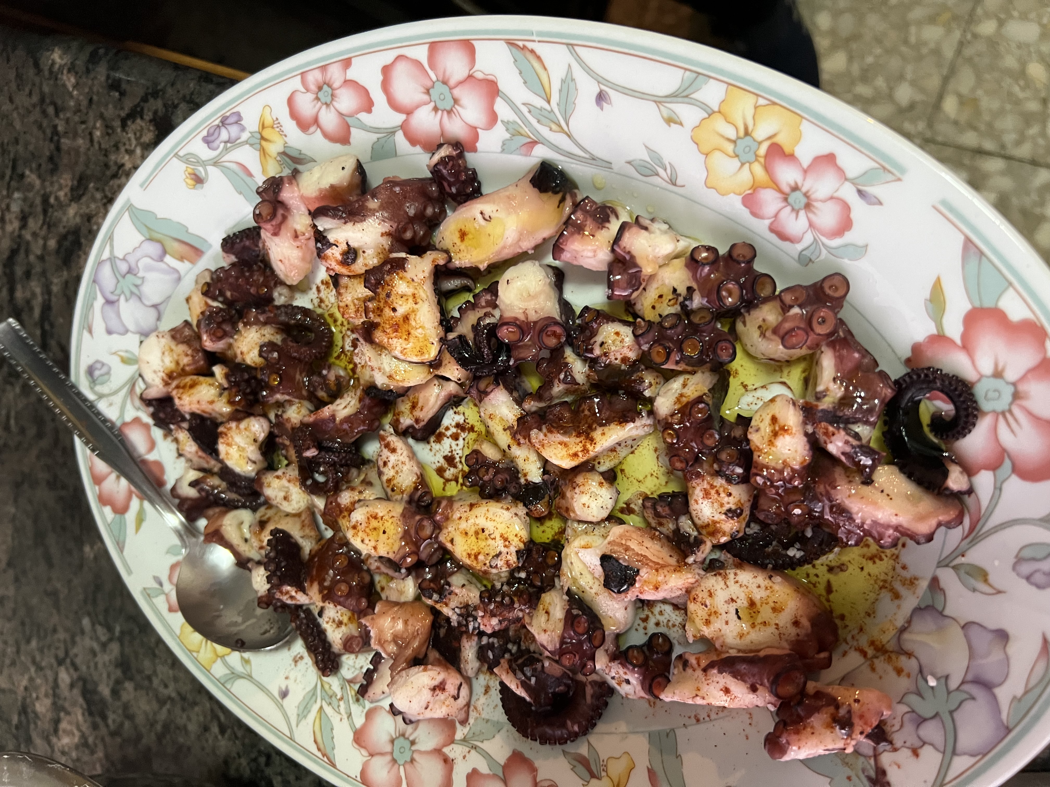 Der Tintenfisch "Pulpo a la Gallega" wird gekocht bis zum Punkt, wo es nicht zu hart und nicht zu weich ist. Geschnitten wurd es mit der Schere und das magische Pulver (Pimiento dulce) darüber.