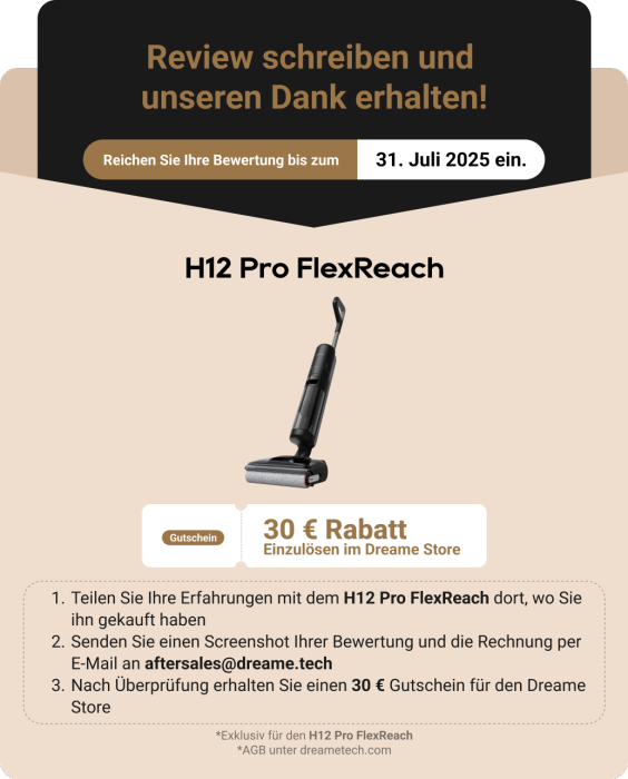 Du hast den H12 Pro FlexReach ausprobiert? Dann möchten wir DEINE Meinung hören! 🧼⚡So sicherst du dir deinen 30 € Gutschein für den Dreame Store 💸: 1️⃣ Verfasse eine Bewertung auf der Plattf...Alles anzeigen