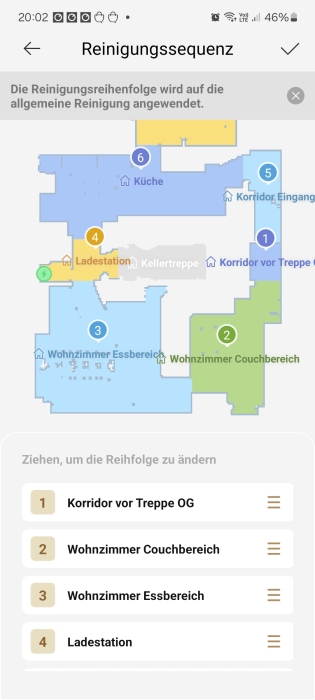 Bei der Raumkarte rechts auf das mittlere Symbol tippen und auf Raumsequenz. Dann bei den 3 Strichen die Räumevin die gewünschte Position ziehen.