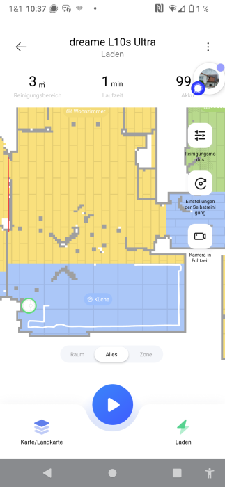 Unser Ultra10+ lässt ein Stück Fliesenboden an der Grenze zum Holzboden des Wohnzimmers aus. In der 3D-Ansicht lassen sich die Wände nur "nach Außen" verschieben, wodurch die Räume größer werde...Alles anzeigen