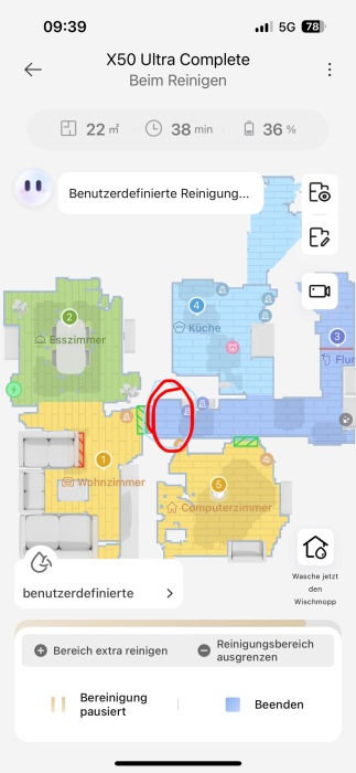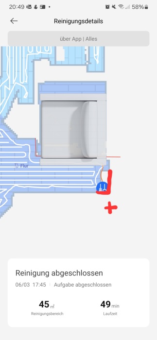 【X50 Ultra Complete】Moin der Roboter reinigt sowohl im Automatik und benutzer definierten Modus immer nur wohn und essbereich so wie das kleine markierte Stück vom Flur. Er sagt dann er er hätte die Aufgabe abgeschloss...Alles anzeigen
